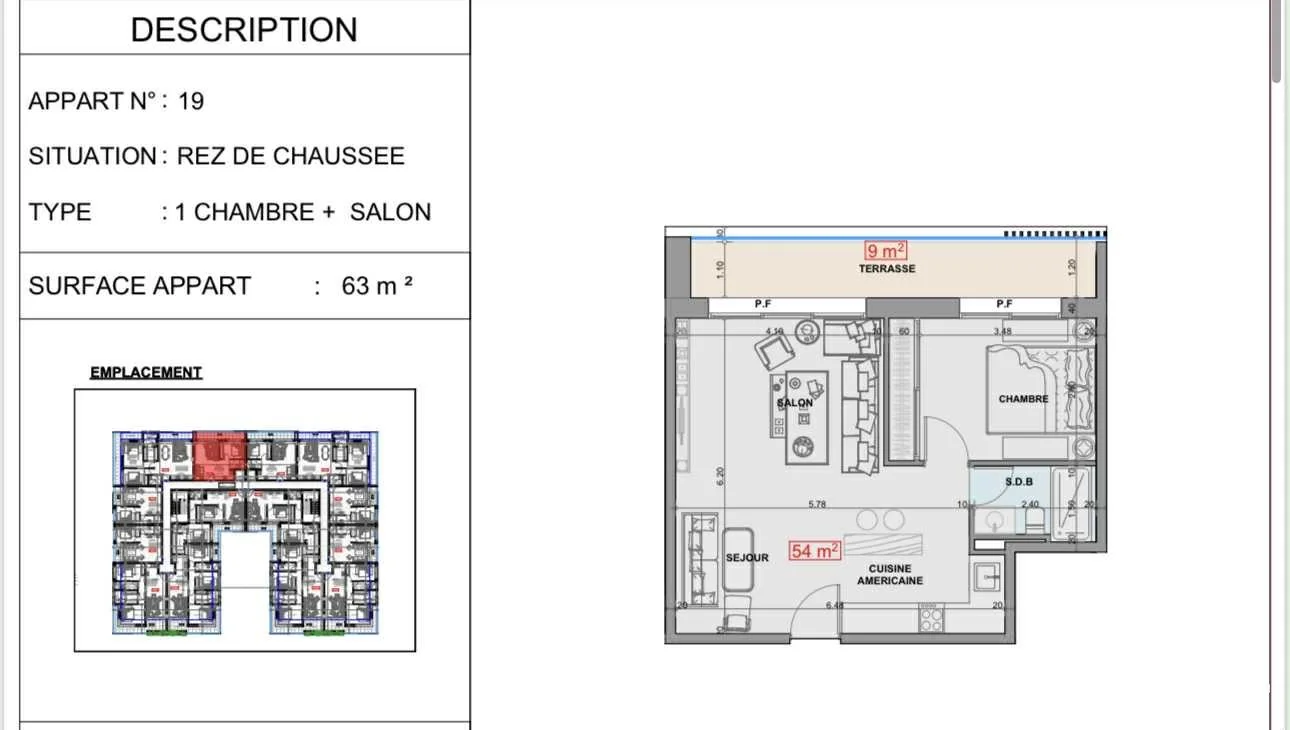 المساحة الإجمالية: 63 متر مربع (منها 9 متر مربع تراس)