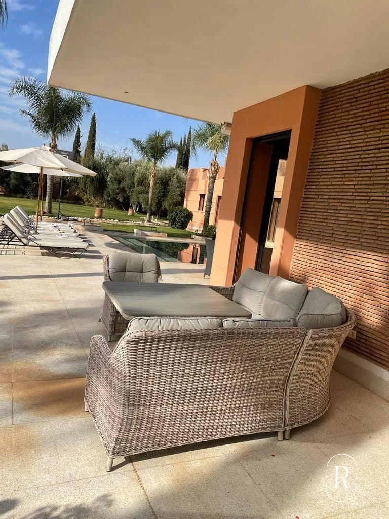 Questa villa comprende: 4 magnifiche suite con spogliatoi e bagni, ampio salone doppio (salone moderno e salone marocchino), zona pranzo con vista sulla piscina, cucina completamente attrezzata, toilette per gli ospiti, salone esterno, zona solarium a bordo piscina.