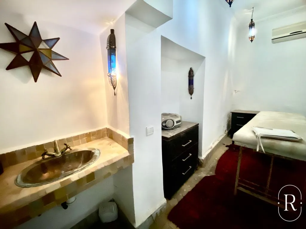 Descriptif du Riad : il se compose de 6 chambres avec SDB et rangement, au RDC il y a un très beau patio arboré avec un bassin, une cuisine avec salle à manger, une salle de massage, toilette invité, 1 chambre avec sdb.